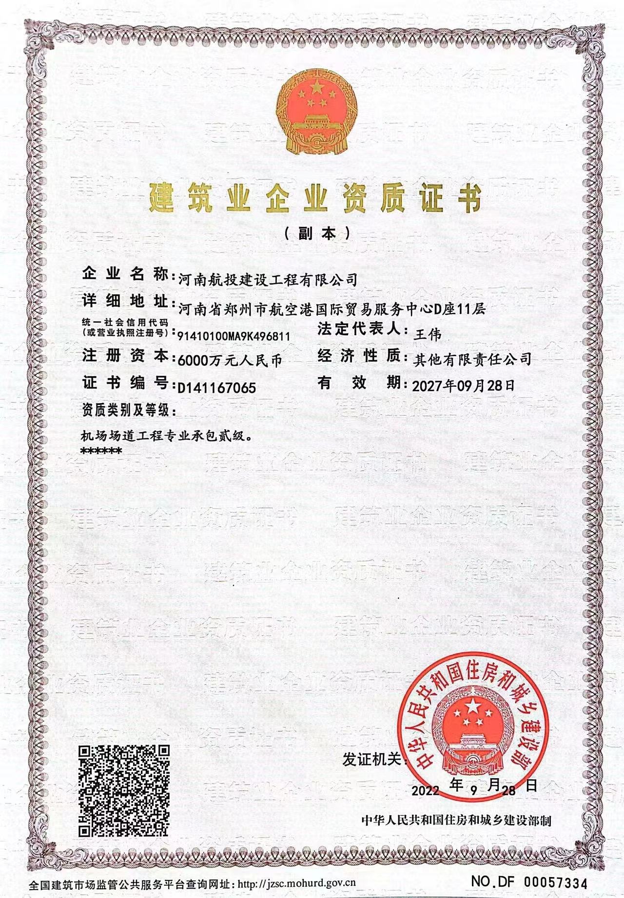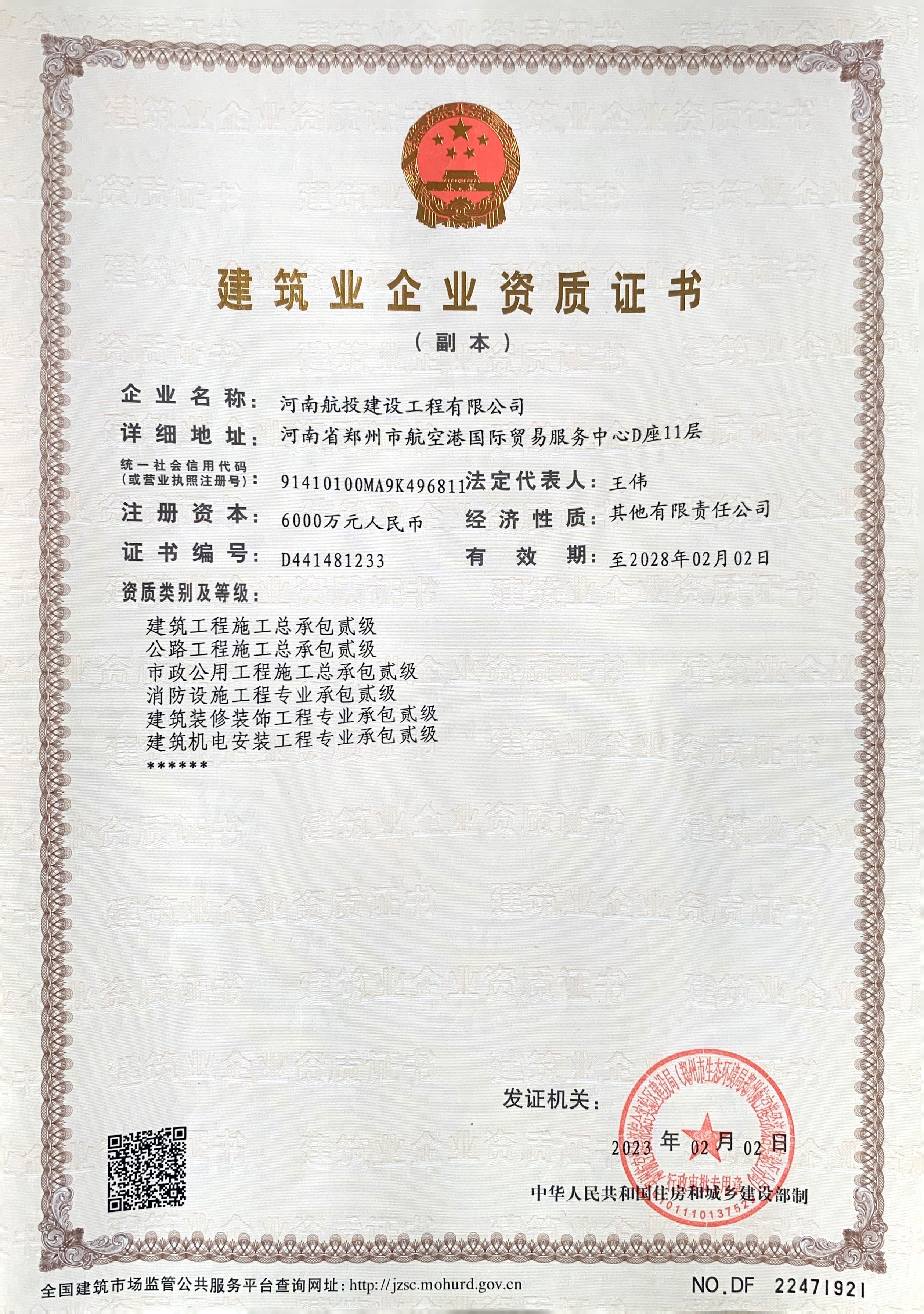 航投建工由河南航投集團(tuán)旗下河南航投航空基礎(chǔ)產(chǎn)業(yè)發(fā)展有限公司與貴州省場(chǎng)道工程有限公司共同出資成立。2022年9月28日,航投建工成功取得機(jī)場(chǎng)場(chǎng)道工程專業(yè)承包二級(jí)資質(zhì);同年12月8日通過河南省住建廳各項(xiàng)審核,取得《建筑施工企業(yè)安全生產(chǎn)許可證》,完成參與市場(chǎng)競(jìng)爭(zhēng)的全部前置條件;12月23日,被評(píng)為鄭州航空港經(jīng)濟(jì)綜合實(shí)驗(yàn)區(qū)建筑業(yè)重點(diǎn)培育企業(yè),為施工總承包及多項(xiàng)專業(yè)資質(zhì)的取得打下堅(jiān)實(shí)基礎(chǔ)。