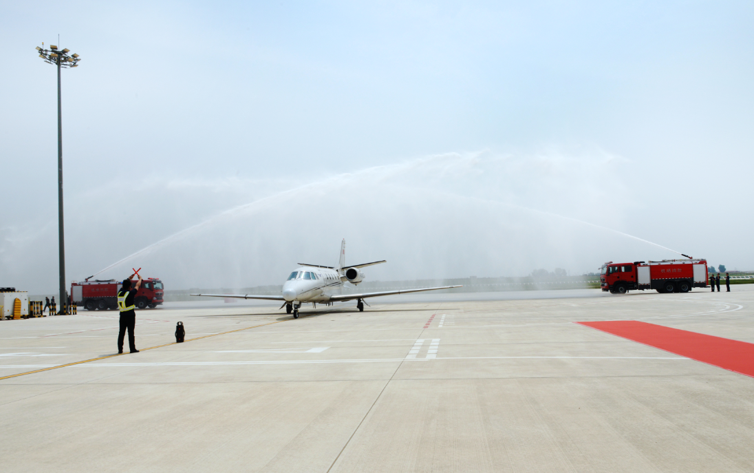 5月17日上午,隨著塔臺(tái)發(fā)出明確指令,一架“獎(jiǎng)狀C560”平穩(wěn)降落在安陽(yáng)紅旗渠機(jī)場(chǎng),并接受“水門禮”。這是中國(guó)民用航空飛行校驗(yàn)中心的校驗(yàn)專用飛機(jī),它的到來意味著安陽(yáng)紅旗渠機(jī)場(chǎng)“第一飛”順利完成,校飛工作正式開始,標(biāo)志著安陽(yáng)紅旗渠機(jī)場(chǎng)從地面建設(shè)向開放運(yùn)行的邁進(jìn)。