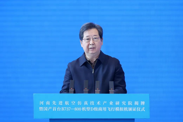 11月26日,河南先進(jìn)航空仿真技術(shù)產(chǎn)業(yè)研究院揭牌暨國(guó)產(chǎn)首臺(tái)B737-800機(jī)型D級(jí)商用飛行模擬機(jī)頒證儀式在航空港區(qū)舉行。省委書(shū)記樓陽(yáng)生出席并講話。