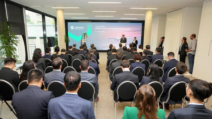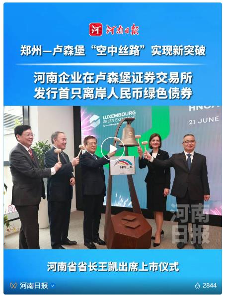 當(dāng)?shù)貢r(shí)間6月21日上午,中豫航空集團(tuán)以河南航投為主體發(fā)行的3年期人民幣境外債券上市儀式在盧森堡證券交易所舉行。這是中國企業(yè)在歐洲發(fā)行的首只支持可持續(xù)航空燃料(SAF)的綠色債券,也是河南企業(yè)發(fā)行的首只離岸人民幣綠色債券,鄭盧“空中絲路”資金融通實(shí)現(xiàn)新突破。