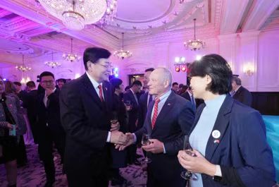 貝泰爾在招待會的致辭中簡要回顧了商貿(mào)團在北京和上海的交流情況,對參加招待會的各方代表表示感謝。致辭后,講臺上的貝泰爾看到張明超一行很是驚喜,立即向老朋友們舉手示意,并在隨后的自由交流環(huán)節(jié)與盧睿朗一起同張明超交談。