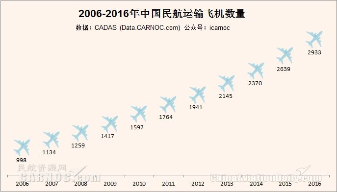 民航資源網(wǎng)2017年1月6日消息:根據(jù)CADAS民航數(shù)據(jù)分析系統(tǒng),至2016年底,中國(guó)民航運(yùn)輸飛機(jī)機(jī)隊(duì)數(shù)量(不含港、澳、臺(tái))達(dá)到了2933架, 全年共引進(jìn)飛機(jī)369架,其中12月份新引進(jìn)飛機(jī)36架。