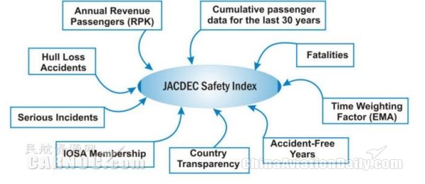 JACDEC安全指標(biāo)的評(píng)比參數(shù)包括在過(guò)去30年間航班墜毀的數(shù)量、傷亡人數(shù)、安全年份年數(shù)以及航司所在國(guó)家政府的透明度等參數(shù)。