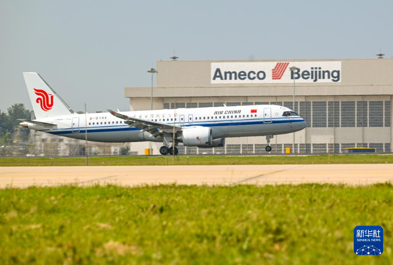 8月29日,國(guó)航首架C919國(guó)產(chǎn)大飛機(jī)降落北京首都國(guó)際機(jī)場(chǎng)。新華社記者 李賀 攝