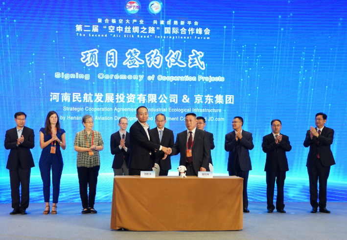 在隨后的成果發(fā)布環(huán)節(jié),河南航投總經(jīng)理、黨委副書記、副董事長劉建葆代表公司分別與中航通用飛機(jī)有限公司(以下簡稱航空工業(yè)通飛)、法國Simaero控股公司、中國檢驗認(rèn)證(集團(tuán))公司(以下簡稱中檢集團(tuán))、京東集團(tuán)簽署戰(zhàn)略合作協(xié)議。黃強(qiáng)及中外嘉賓代表見簽。趙磊主持發(fā)布圖書《“一帶一路”高質(zhì)量發(fā)展——河南“空中絲綢之路”的生動實踐》。該書以紀(jì)實筆觸全方位記錄了河南主動融入“一帶一路”建設(shè),向天尋路,架起一條互利各國交通運(yùn)輸、聚合經(jīng)貿(mào)文化發(fā)展的“空中絲綢之路”,真實展現(xiàn)出河南打造內(nèi)陸開放新高地、實現(xiàn)中原更出彩的新局面。