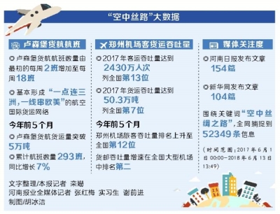 2017年6月14日,國家主席習(xí)近平在會(huì)見盧森堡首相貝泰爾時(shí),明確提出要深化雙方在“一帶一路”建設(shè)框架內(nèi)金融、產(chǎn)能等合作,中方支持建設(shè)鄭州—盧森堡“空中絲綢之路”。