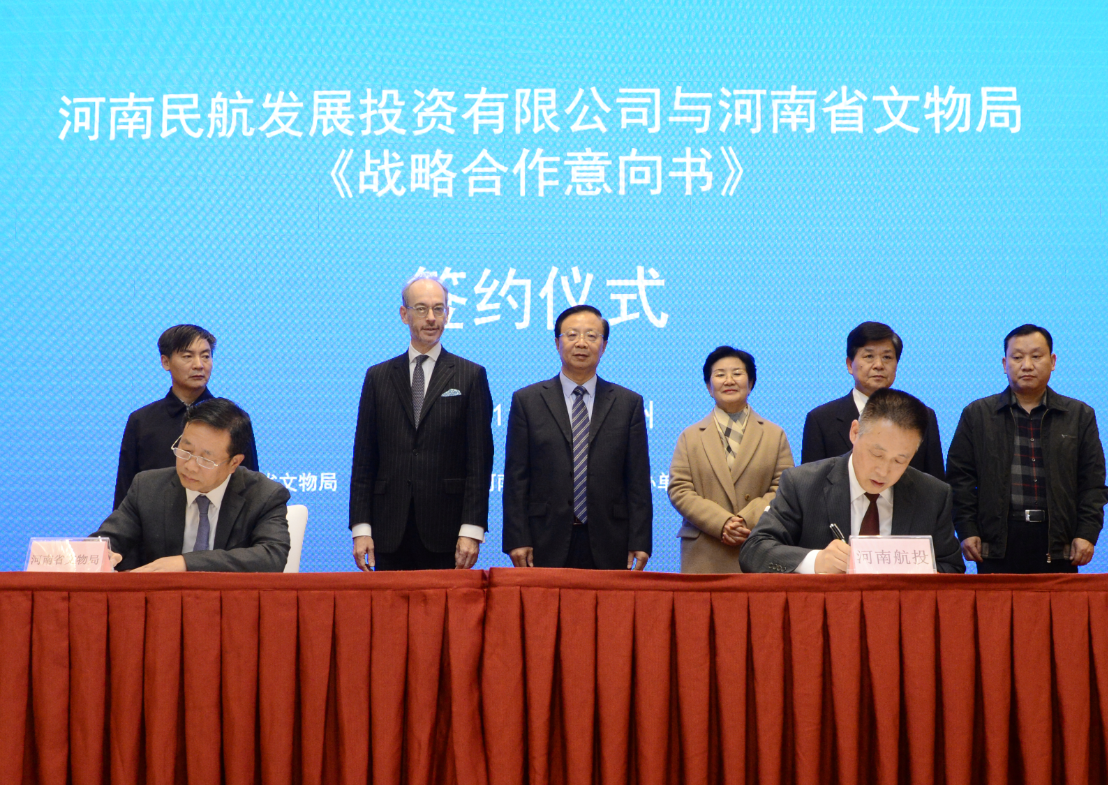 為進一步擴大雙方合作范圍,儀式最后雙方進行了簽約。劉建葆與田凱分別代表河南航投與河南省文物局簽署合作意向書,約定雙方將充分發(fā)揮各自優(yōu)勢,積極落實省政府《鄭州-盧森堡“空中絲綢之路”建設專項規(guī)劃(2017-2025)》,提升豫歐文化交流水平,促進兩地民心相通。