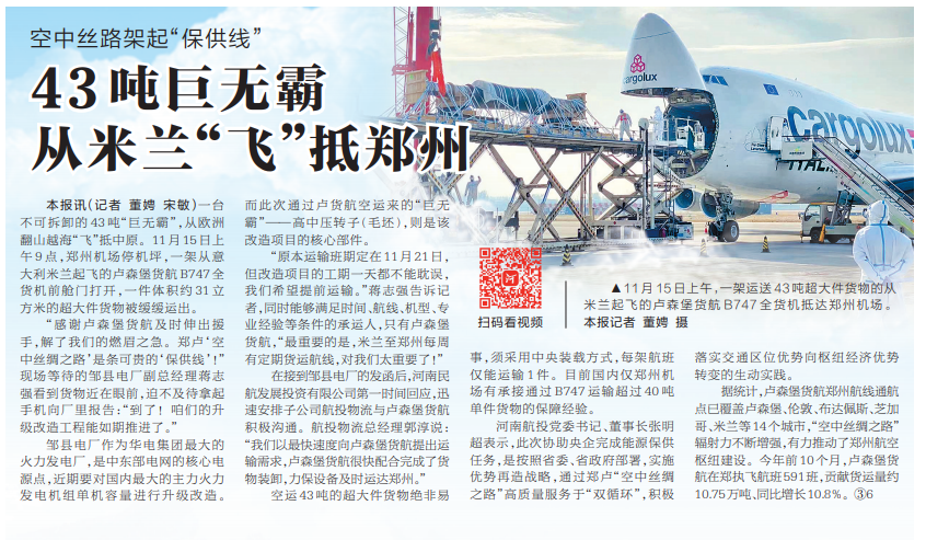 本報(bào)訊(記者 董娉 宋敏)一臺(tái)不可拆卸的43噸“巨無(wú)霸”,從歐洲翻山越?!帮w”抵中原。11月15日上午9點(diǎn),鄭州機(jī)場(chǎng)停機(jī)坪,一架從意大利米蘭起飛的盧森堡貨航B747全貨機(jī)前艙門(mén)打開(kāi),一件體積約31立方米的超大件貨物被緩緩運(yùn)出。