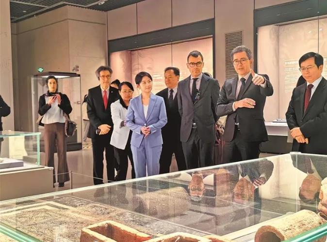 盧森堡駐華大使盧睿朗(右三)一行走進(jìn)“小而美——盧森堡文物精品展”現(xiàn)場。